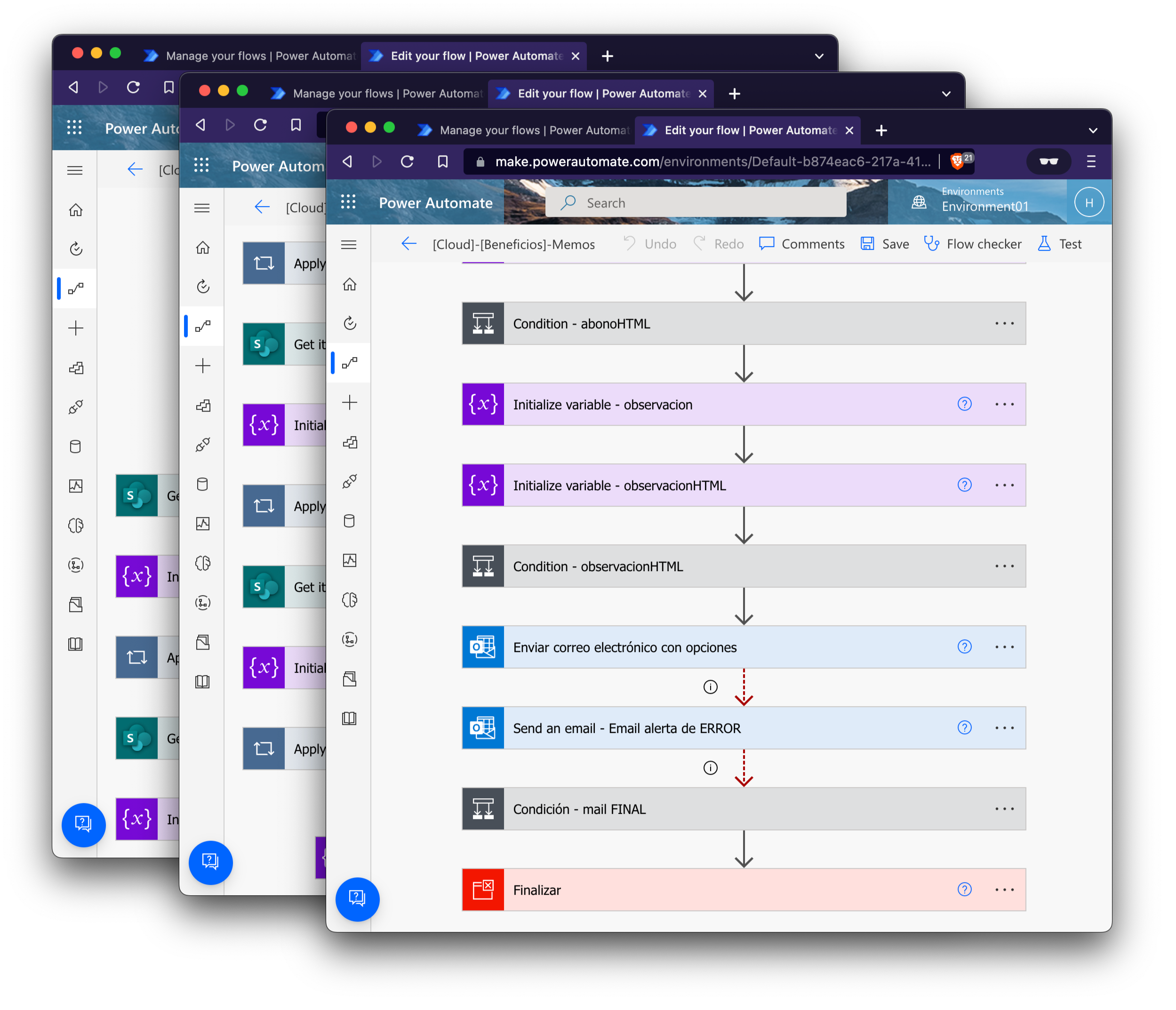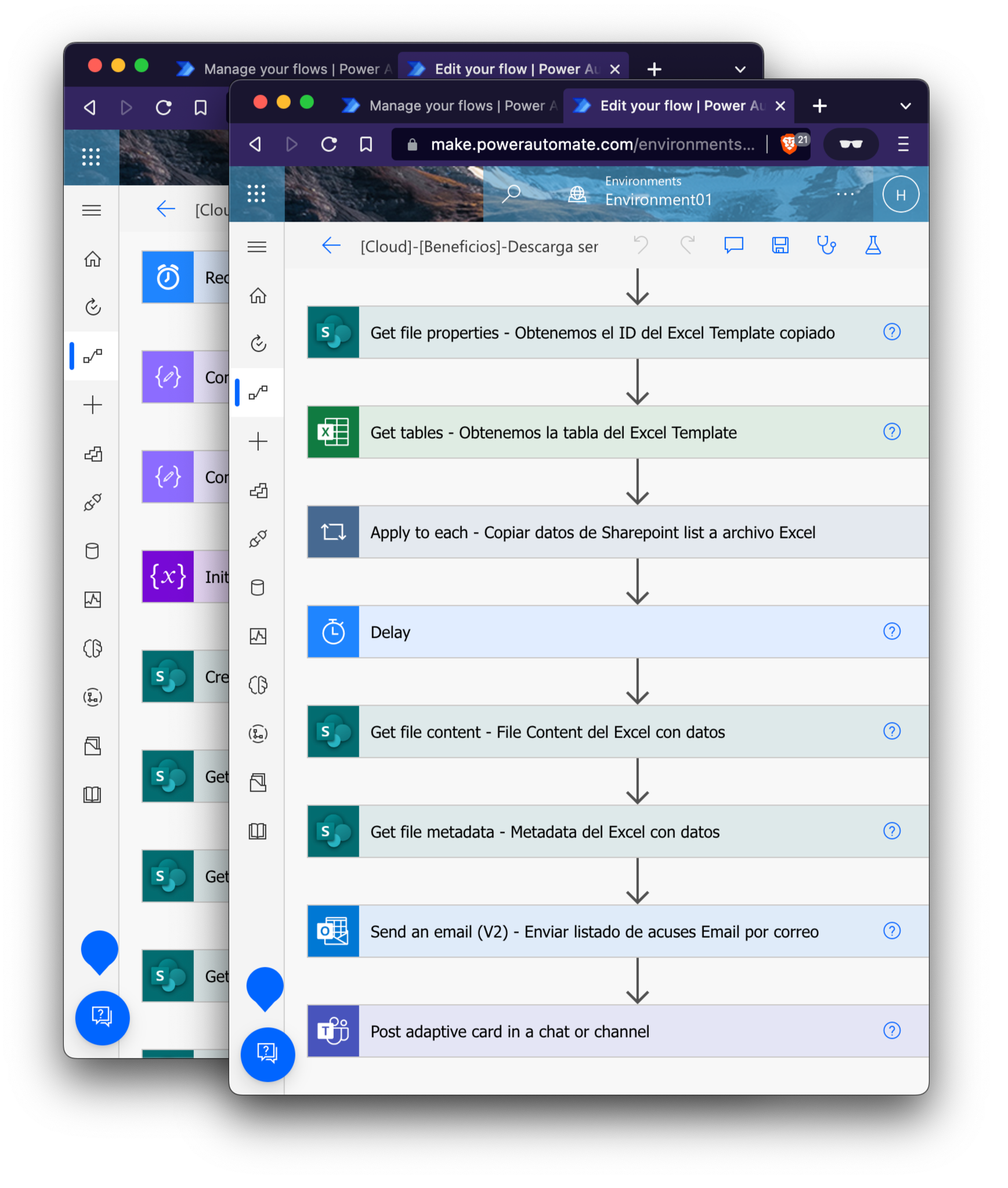 Automation workflows integrating different apps like Teams, Sharepoint, Excel and Outlook